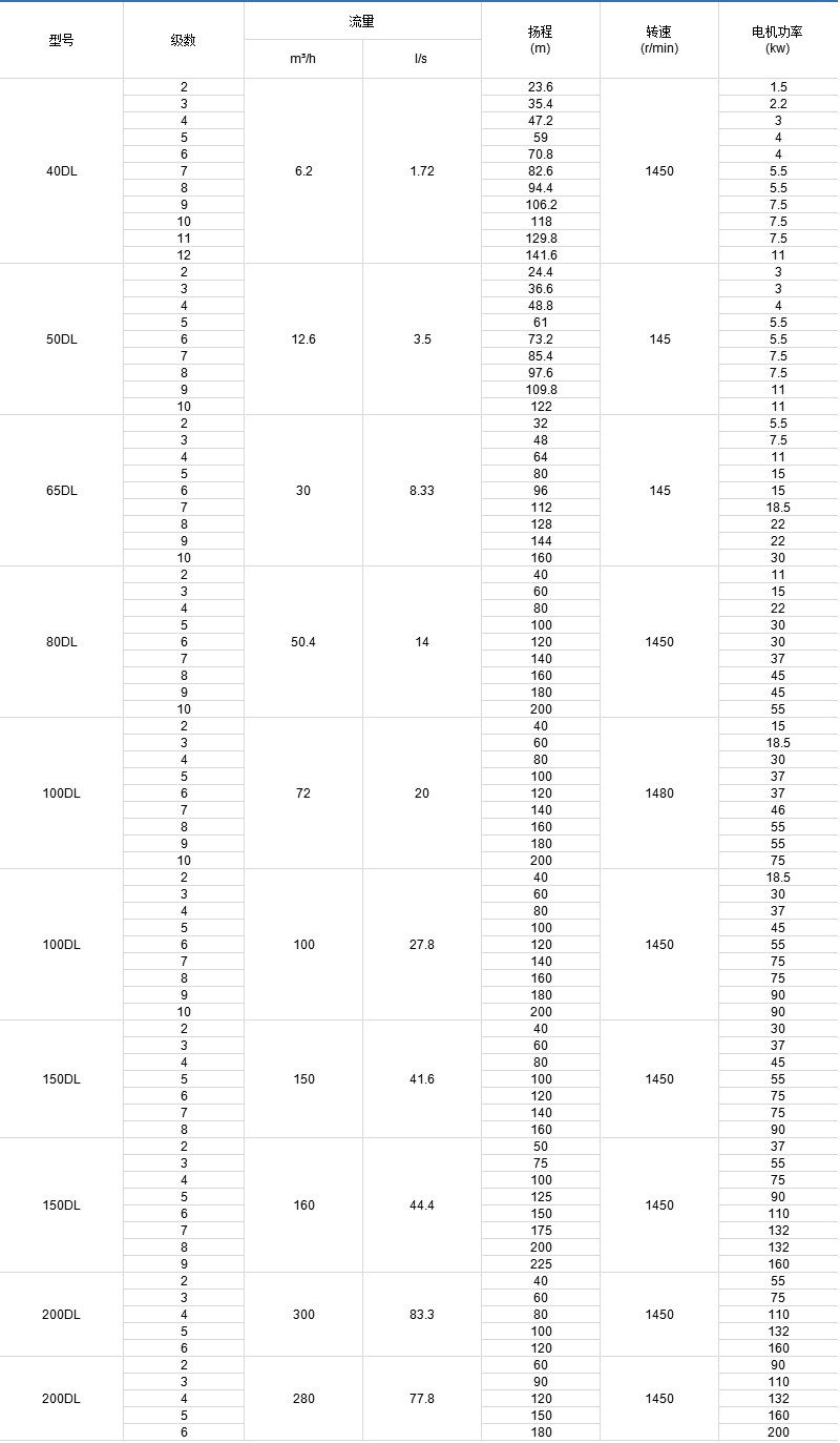 DL、DLR型泵系立式單吸多級分段式離心泵,供輸送不含固體顆粒的清水及物理化學性質類似于水的液體之用。主要用于高層建筑供水,也可應用于廠礦給排水、輸送液體的流量范圍為6.2~280m3/h,揚程范圍為18.5~225m,配套功率范圍為1.5~200kw,口徑范圍為Ф40~Ф200mm。