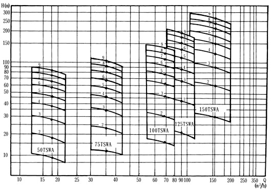 TSWA型多級離心泵全系列共5個品種40個規(guī)格,其性能范圍流量Q=1.5~191m3/h,揚程h=17~247m,轉速n=1450r/min。